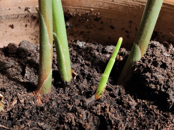Har du et stykke ingefær med synlige vækstknopper, kan du plante dem med knopperne opad nær jordoverfladen, og friske spiselige stængler vil skyde op. Jo større potten er, jo mere breder roden sig under jorden. Foto: PR.
